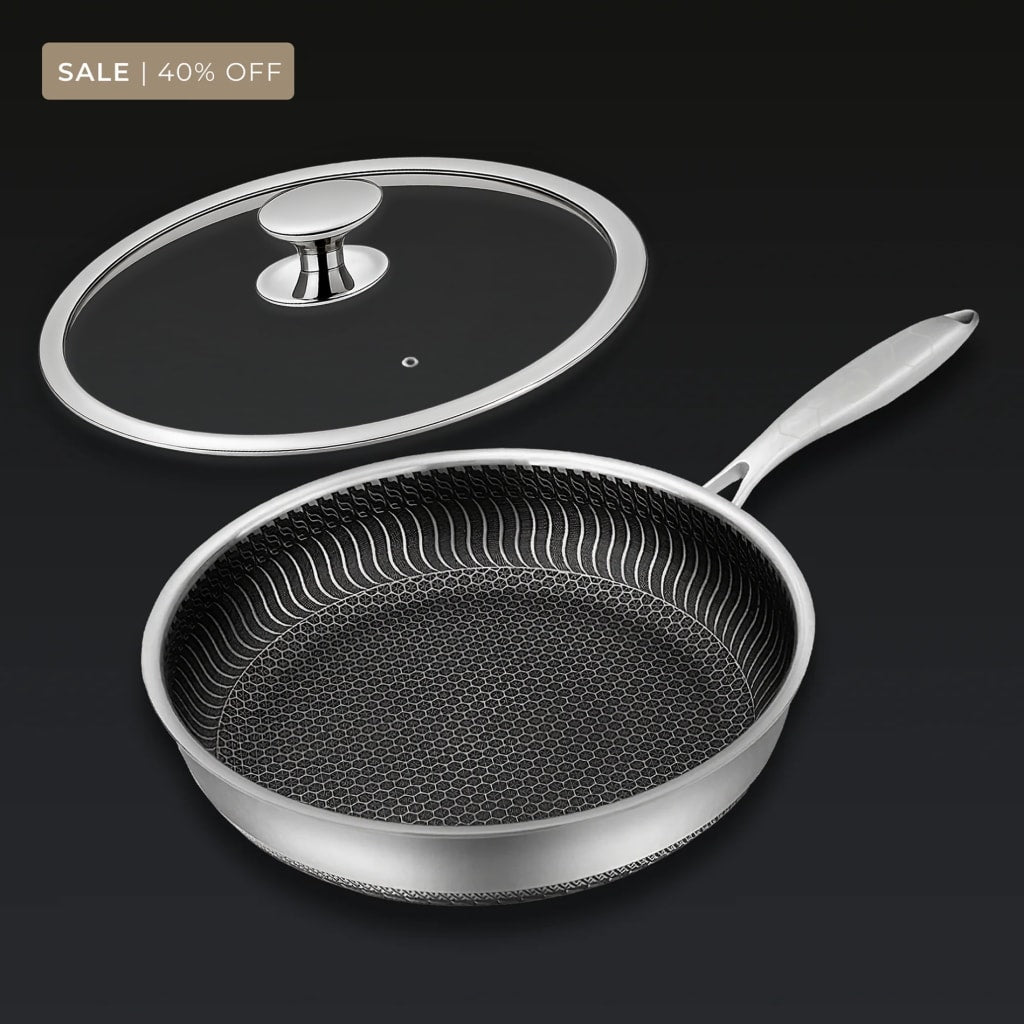PureClad ha una costruzione a triplo strato, che combina acciaio inossidabile, ghisa e la nostra innovazione NovaShield. Gli esagoni in acciaio in rilievo garantiscono una capacità di sigillatura superiore, abbinata alle scanalature NovaShield, uno strato ceramico con proprietà antiaderenti che facilita il distacco degli alimenti senza l’uso di sostanze chimiche nocive. Il nostro design ibrido offre la durata dell’acciaio inossidabile e la praticità della cottura antiaderente. Compatibile con tutti i tipi di fornelli, inclusa l’induzione, PureClad™ è progettata per garantire prestazioni durature e una pulizia facile.